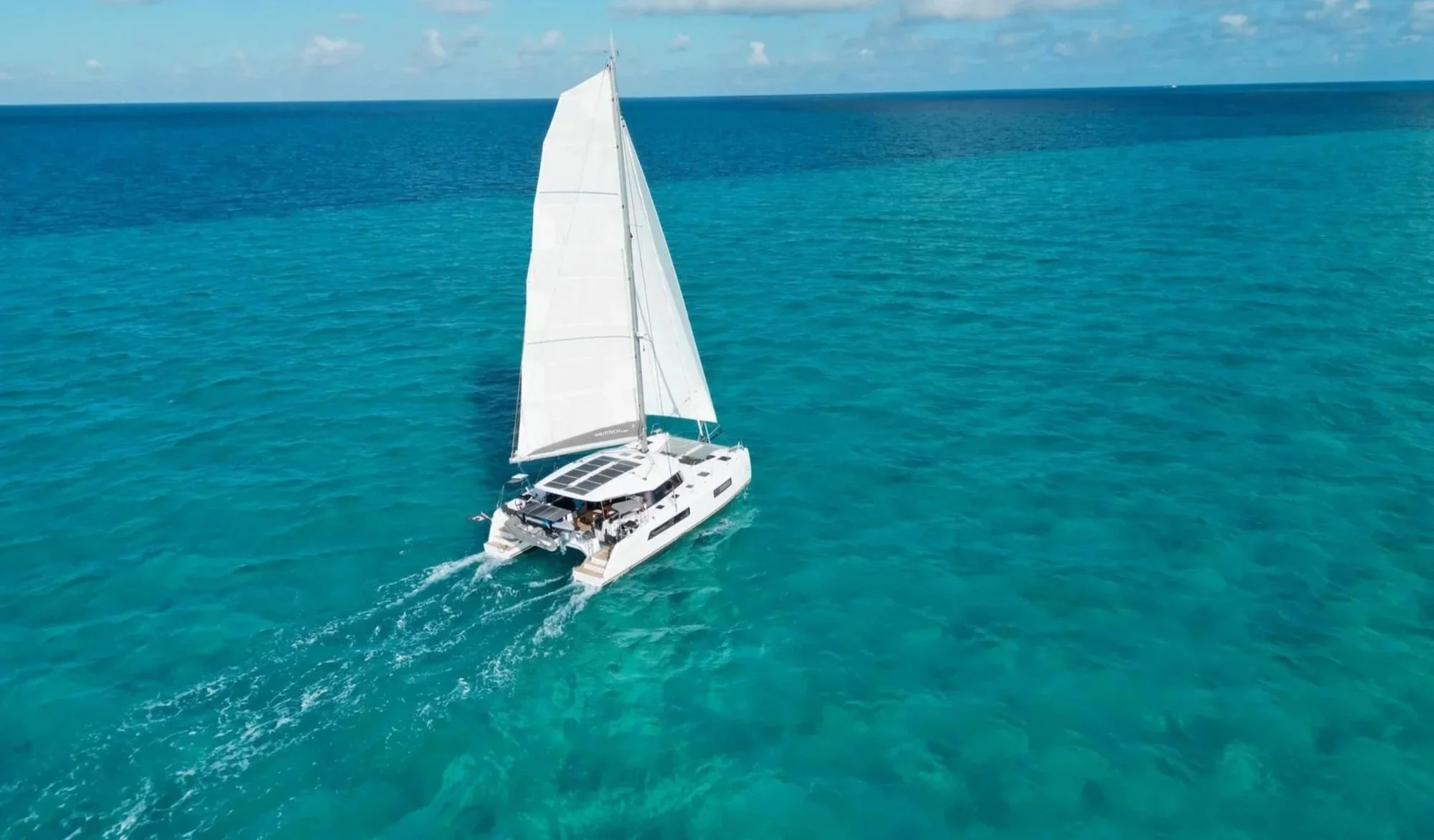 Inside, the catamaran offers a bright, warm, and functional living space designed for comfort and ease during life at sea. Large panoramic windows fill the interior with natural light throughout the day and keep a constant visual connection with the surrounding water and horizon. The atmosphere inside feels open and calm, allowing the boat to feel like a true floating home rather than a confined space.